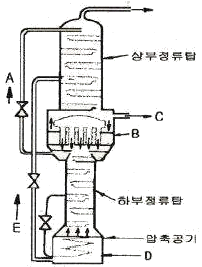 다음 [그림]은 공기의 분리장치로 쓰이고 있는 복식 정류탑의 구조도이다. 흐름 C의 액의 성분과 장치 D의 명칭을 옳게 나타낸 것은?