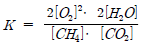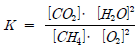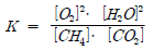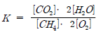 다음 반응식의 평형상수(K)를 올바르게 나타낸 것은? (단, A : CH4, B : O2, C : CO2, D : H2O)