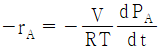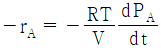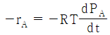 이상기체인 A와 B가 일정한 부피 및 온도의 반응기에서 반응이 일어날 때 반응물 A의 반응속도식(-rA)으로 옳은 것은? (단, PA는 A의 분압을 의미한다.)