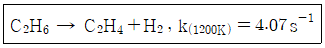 다음 비가역 기초반응에 의하여 연간 2억 kg 에틸렌을 생산하는데 필요한 플러그흐름 반응기의 부피(m3)는? (단, 공장은 24시간 가동하며, 압력은 8 atm, 온도는 1200K로 등온이며 압력강하는 무시하고, 전화율 90%로 반응한다.)
