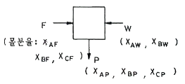 그림과 같은 공정에서 물질수지도를 작성하려면 측정해야 할 최소한의 변수(자유도)는? (단, A, B, C는 성분을 나타내고 F 흐름은 3성분계, W 흐름은 2성분계, P 흐름은 3성분계이다.)