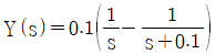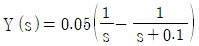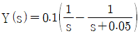 교반탱크에 100L의 물이 들어있고 여기에 10%의 소금용액이 5L/min로 공급되며 혼합액이 같은 유속으로 배출될 때 이 탱크의 소금농도식의 Laplace 변환은?