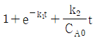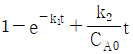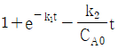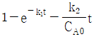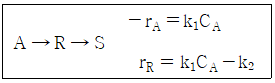 A가 R을 거쳐 S로 반응하는 연속반응과 A와 R의 소모 및 생성 속도 아래와 같을대, 이 반응을 회분식 반응기에서 반응시켰을 때의 CR/CA0는? (단, 반응 시작 시 회분식 반응기에는 순수한 A만을 공급하여 반응을 시작한다.)