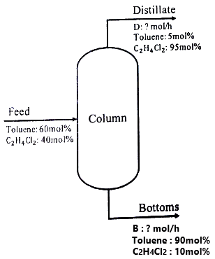 40mol% C2H4Cl2 톨루엔 혼합용액이 100 mol/h로 증류탑에 공급되어 아래와 같은 조성으로 분리될 때, 각 흐름의 속도(mol/h)는?