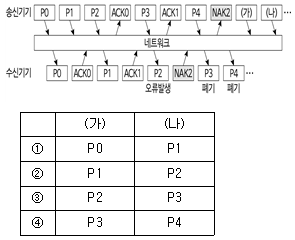 다음 Go-Back-N ARQ(Automatic Repeat reQuest)를 사용하는 송신기기와 수신기기 사이에 주고받은 통신 패킷 중 (가), (나)에 들어갈 내용을 바르게 연결한 것은? (단, 윈도 크기는 3이다)