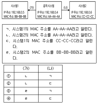 다음 랜(LAN)에서 '공격시스템'이 ARP 스푸핑(spoofing) 공격을 위해 (가), (나)에서 수행하는 작업을 ㄱ~ㄹ에서 찾아 바르게 연결한 것은? (단, MAC 주소는 24비트로 가정한다)