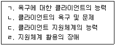 사례관리과정에서 사정영역에 관한 내용으로 옳은 것을 모두 고른 것은?