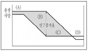 <보기>는 인구변천단계에 대한 그림이다. (A)~(D)에 해당하는 단계로 가장 옳은 것은?