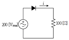 그림의 회로에 200[Vrms] 정현파 전압을 인가하였다. 저항에 흐르는 평균전류[A]는? (단, 회로는 이상적이다)
