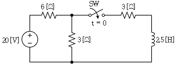 그림의 회로에서 t=0일 때, 스위치 SW를 닫았다. 시정수 τ[s]는?
