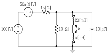 그림의 회로에서 t=∞ 일 때, 결합 인덕터에 저장되는 에너지가 0.75[J]이다. 결합계수 는? (단, u(t)는 단위계단 함수이다)