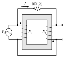 다음 그림에서 철심의 1차측에 N1=100회, 2차측에 N2=200회의 코일을 감고, 1차 코일에 V1=100[V]의 전압을 인가한다. 이때 저항 100[Ω]에 흐르는 전류 I[A]는? (단, 변압기는 이상적이며 전압과 전류는 실횻값이다)