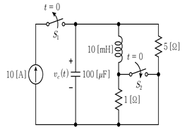 다음 회로에서 t=0 일 때, 스위치 S1은 개방되고 스위치 S2는 닫힌다. t≥0 에서 전압 vc(t)[V]의 자연 응답 특성은?