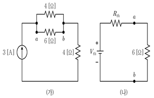 그림 (가)의 단자 a, b에 대한 테브난 등가회로가 그림 (나)이다. 전압 Vth[V]와 저항 Rth[Ω]의 합(Vth+Rth)은?