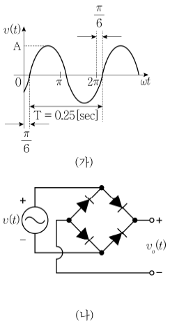 그림 (가)의 입력전압이 (나)의 정류회로에 인가될 때, 입력전압 v(t)와 출력전압 vo(t)에 대한 설명으로 옳지 않은 것은? (단, 다이오드는 이상적인 소자이고, 출력전압의 평균값은 200 [V]이다)