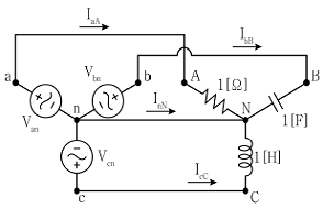 그림의 Y-Y 결선 불평형 3상 부하 조건에서 중성점 간 전류 InN [A]의 크기는? (단, ω=1 [rad/s], Van=100∠0° [V], Vbn=100∠-120° [V], Vcn=100∠-240° [V]이고, 모든 전압과 전류는 실횻값이다)