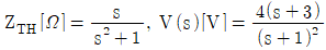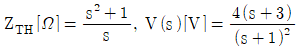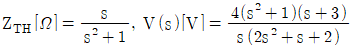 그림의 (가)회로를 (나)회로와 같이 테브난(Thevenin) 등가변환하였을 때, 등가 임피던스 ZTH [Ω]와 출력전압 V(s) [V]는? (단, 커패시터와 인덕터의 초기 조건은 0이다)