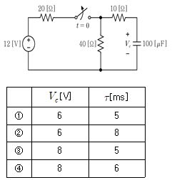 그림의 회로에서 스위치가 닫힌 상태로 오랜 시간이 경과한 후 t=0[s]에서 열렸다. t≥0 에서 커패시터의 초기전압 Vc[V]와 시정수 τ[ms]는?
