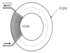 그림과 같이 토로이드 자성체에 코일을 500회 감고 0.3[A]의 전류를 흘릴 때, 자성체 내부의 자속[Wb]은? (단, 자성체의 자기저항은 0.25×105[H-1]이고, 누설자속은 없다)