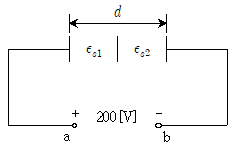 그림과 같이 간격 d=4[cm]인 평판 커패시터의 두 극판 사이에 두께와 면적이 같은 비유전율 εs1=6, εs2=9인 두 유전체를 삽입하고 단자 ab에 200[V]의 전압을 인가할 때, 비유전율 εs2인 유전체에 걸리는 전압[V]과 전계의 세기[kV/m]는? (순서대로 전압,전계의 세기)