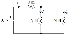 다음 회로의 r1, r2에 흐르는 전류비 I1:I2=1:2가 되기 위한 r1[Ω]과 r2[Ω]는? (단, 입력전류 I = 5[A]이다) (순서대로 r1, r2)