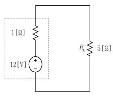 그림과 같이 내부저항 1[Ω]을 갖는 12[V] 직류 전압원이 5[Ω] 저항 RL에 연결되어 있다. 저항 RL에서 소비되는 전력[W]은?
