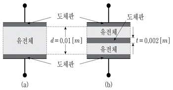 그림 (a)는 도체판의 면적 S=0.1[m2], 도체판 사이의 거리 d=0.01[m], 유전체의 비유전율 εr=2.5인 평행판 커패시터이다. 여기에 그림 (b)와 같이 두 도체판 사이의 거리 d=0.01[m]를 유지하면서 두께 t=0.002[m], 면적 S=0.1[m2]인 도체판을 삽입했을 때, 커패시턴스 변화에 대한 설명으로 옳은 것은?
