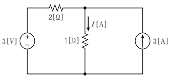 그림의 회로에서 저항 1[Ω]에 흐르는 전류 I[A]는?