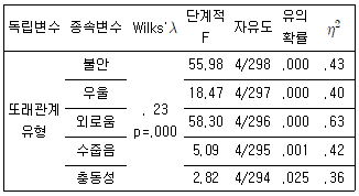 다음은 또래관계 유형에 따른 심리적 특성의 차이를 확인하기 위해 다변량분산분석을 실시한 결과이다. 옳지 않은 것은?