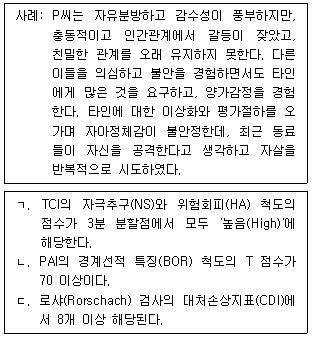 다음 사례에서 P씨의 특징을 반영하는 심리검사 결과로 적절한 것을 모두 고른 것은?
