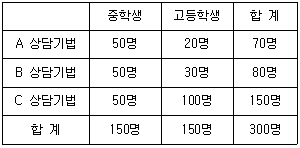 다음 표는 중학생과 고등학생들이 선호하는 상담기법의 차이를 보여준다. B 상담기법을 선호하는 중학생과 고등학생의 기대빈도의 합은?