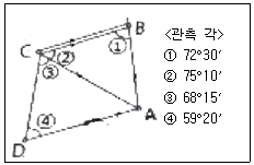 B, C, D점에서 그림과 같이 ①~④의 각을 관측하였다. BC의 거리가 120.00m일 때, CD의 거리는?