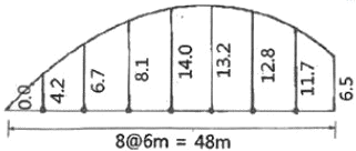 그림과 같이 곡선으로 둘러싸인 지역의 심프슨(simpson) 제1법칙에 의한 면적은? (단, 단위는 m이다.)