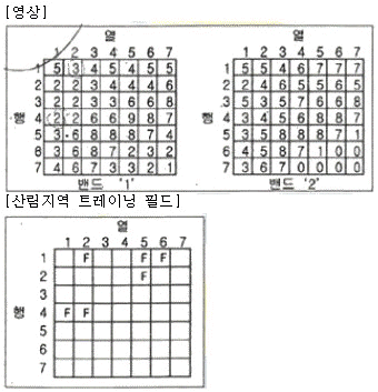 아래와 같은 영상을 분석하지 위해 산림지역의 트레이닝 필드를 선정하였따. 트레이닝 필드로부터 산출되는 각 밴드의 평균값은?