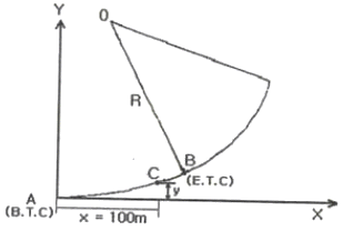 직선과 반지름(R)이 500m인 원곡선 사이에 3차 포물선에 의한 150m 길이의 완화곡선을 설치할 경우에 완화곡선 시점 A(B.T.C)로부터 주접선상 100m인 지점에서 완화곡선 위의 C점까지 수직거리 y는?