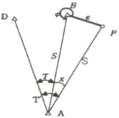 삼각점 A에 기계를 설치하여 삼각점 B를 시준하여 각 T를 관측하고자 하였으나 장애물로 인해 B로부터 e만큼 떨어진 위치의 점 P를 관측하여 T’=60°30’를 얻었다면 각 T는? (단, S=2km, e=5m, ø=310°20’)