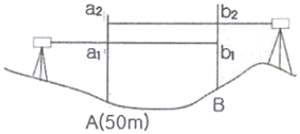 그림과 같이 교호수준측량을 실시하였을 때 B점의 표고는? (단, a1=0.64m, a2=2.87m, b1=0.07m, b2=2.42m)