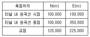 터널측량에서 측점의 위치가 표와 같을 경우 터널 내 곡선의 교각은?