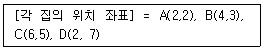 A지점에 2명, B지점에 1명, C지점에 3명, D지점에 4명 등 A, B, C, D 4개의 지점에 10명의 사람이 있다. 10명 모두가 모일 경우 사람들의 총 이동거리를 최소로 할 수 있는 지점의 좌표는?