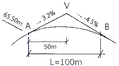 그림에서 V지점에서 해당하는 종단곡선상의 계획고는? (단, 종단곡선은 2차 포물선이고, A점의 계획고=65.50m)