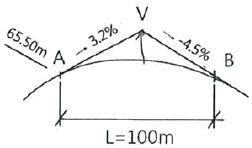 그림에서 V지점에 해당하는 종단곡선(Vertical curve) 상의 계획고(Elevation)는? (단, 종단곡선은 2차포물선이고, A점의 계획고=65.50m)