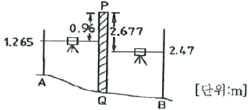 그림과 같이 담장 PQ가 있어 P점에서 표척을 거꾸로 세워 관측하여 그림과 같은 결과를 얻었다. B점의 표고는? (단, A점의 표고는 135.000m 이다.)