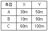 측점 A, B, C의 좌표가 아래와 같을 때 토지(△ABC)의 면적은?