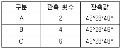 동일한 각을 관측 횟수를 다르게 적용하여 얻은 결과가 표와 같을 때, 각의 최확값은?