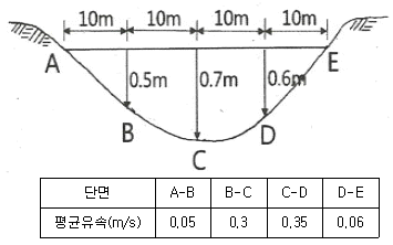 각 구간의 평균유속이 표와 같은 때, 그림과 같은 단면을 갖는 하천의 유량은?