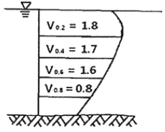 하천측량에서 그림과 같이 깊이에 따른 유속(m/s)을 얻었을 때, 3점법에 의한 평균유속은?