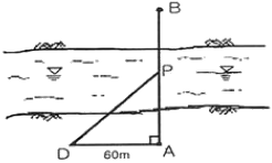 하천의 심천측량을 하기 위해 그림과 같이 AB선에 직각으로 기선 AD=60m를 관측하였다. 위치 P에서 관측장비를 사용하여 ∠APD=50°를 측정하였다면 AP의 거리는?
