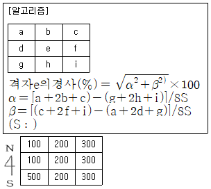 아래 [알고리즘]을 참고하여 DEM 데이터에서 중앙 격자의 경사(%)와 경사향(방위각)을 구한 것으로 옳지 않은 것은? (단, 격자 상의 수치는 표고값(m)이며, 격자 간격은 100m이다.)(오류 신고가 접수된 문제입니다. 반드시 정답과 해설을 확인하시기 바랍니다.)