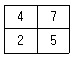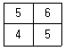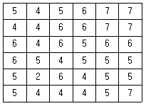 그림은 6×6화소 크기의 래스터 데이터를 수치적으로 표현한 것이다. 이 데이터를 2×2 화소 크기의 데이터로 영상재배열 하고자 한다. 미디언필터(Median Fiter)를 이용하여 2×2화소 데이터의 수치값을 결정하고자 할 때 결과로 옳은 것은?