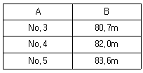 도로의 중심선을 시점 No.0에서 No.7까지 20m씩 종단측량한 결과의 일부가 표와 같다. 도로 계획선의 기울기가 상향 1/100이고 No.4에서 지반고와 계획고가 같다고 할 때, No.3의 성토고(A)와 No.5의 정토고(B)는?